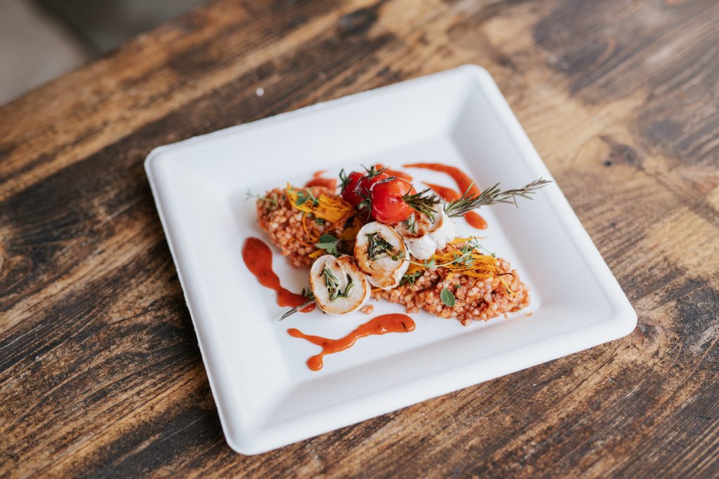 Zöldséges csirketekercsek, paradicsomos hajdinával és sült paradicsommal